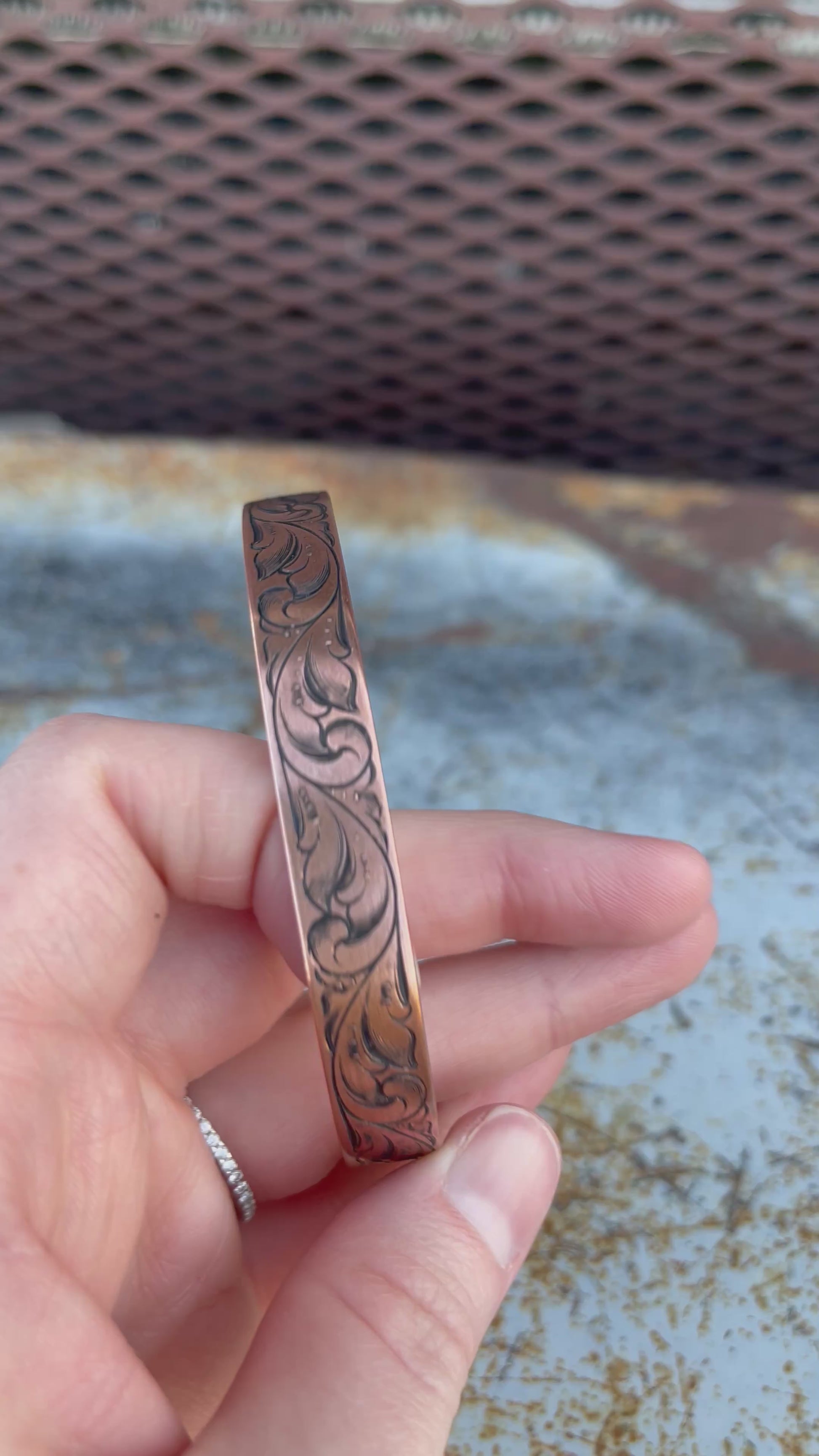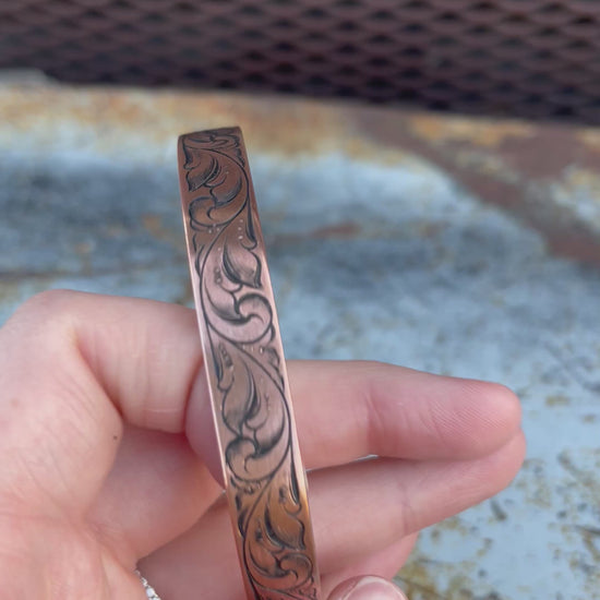 Copper band with hand engraved scrollwork. Pair it with a twisted copper bracelet for a unique look (twisted bracelet not included). 6" long, 3/8" wide.