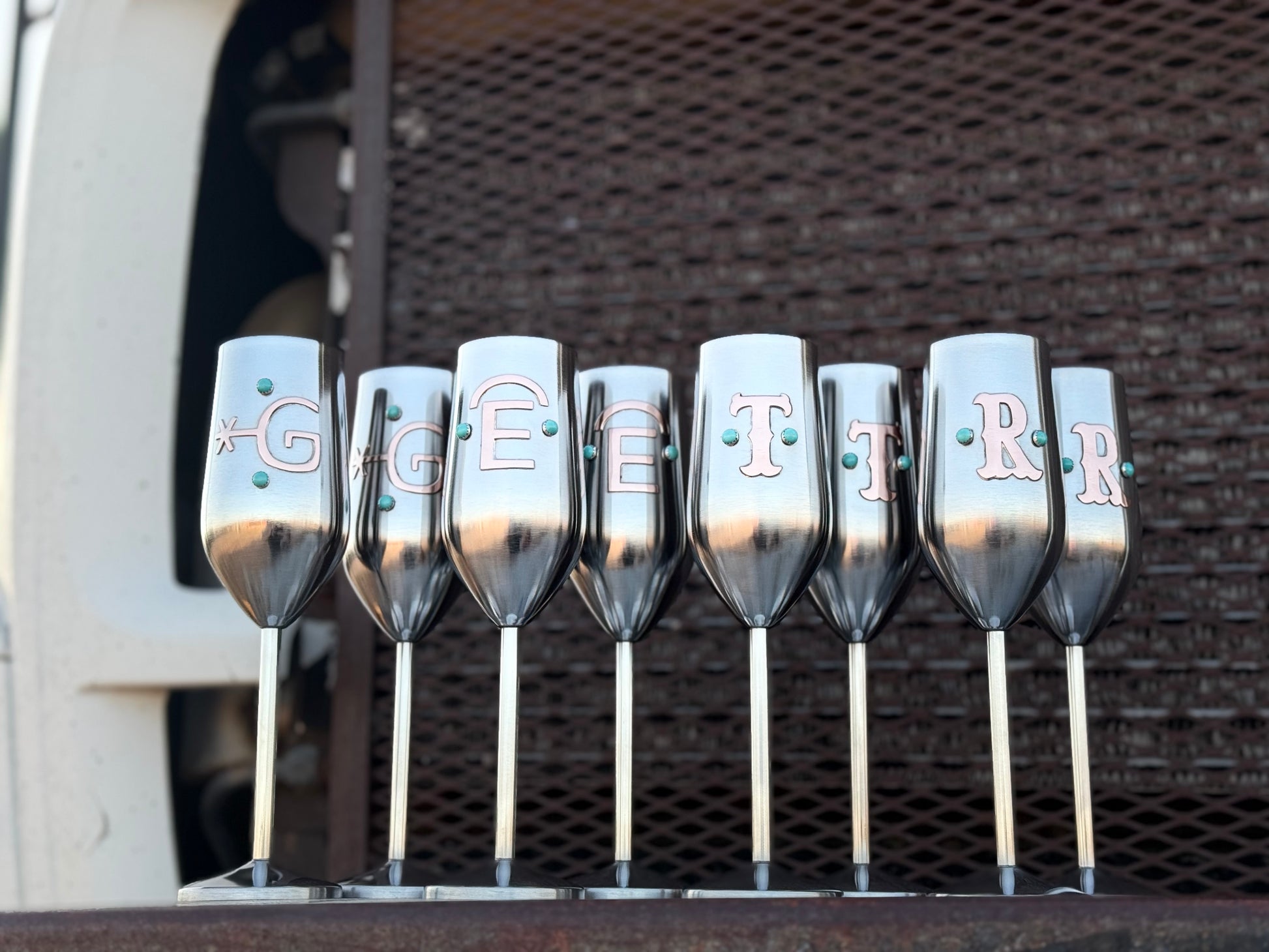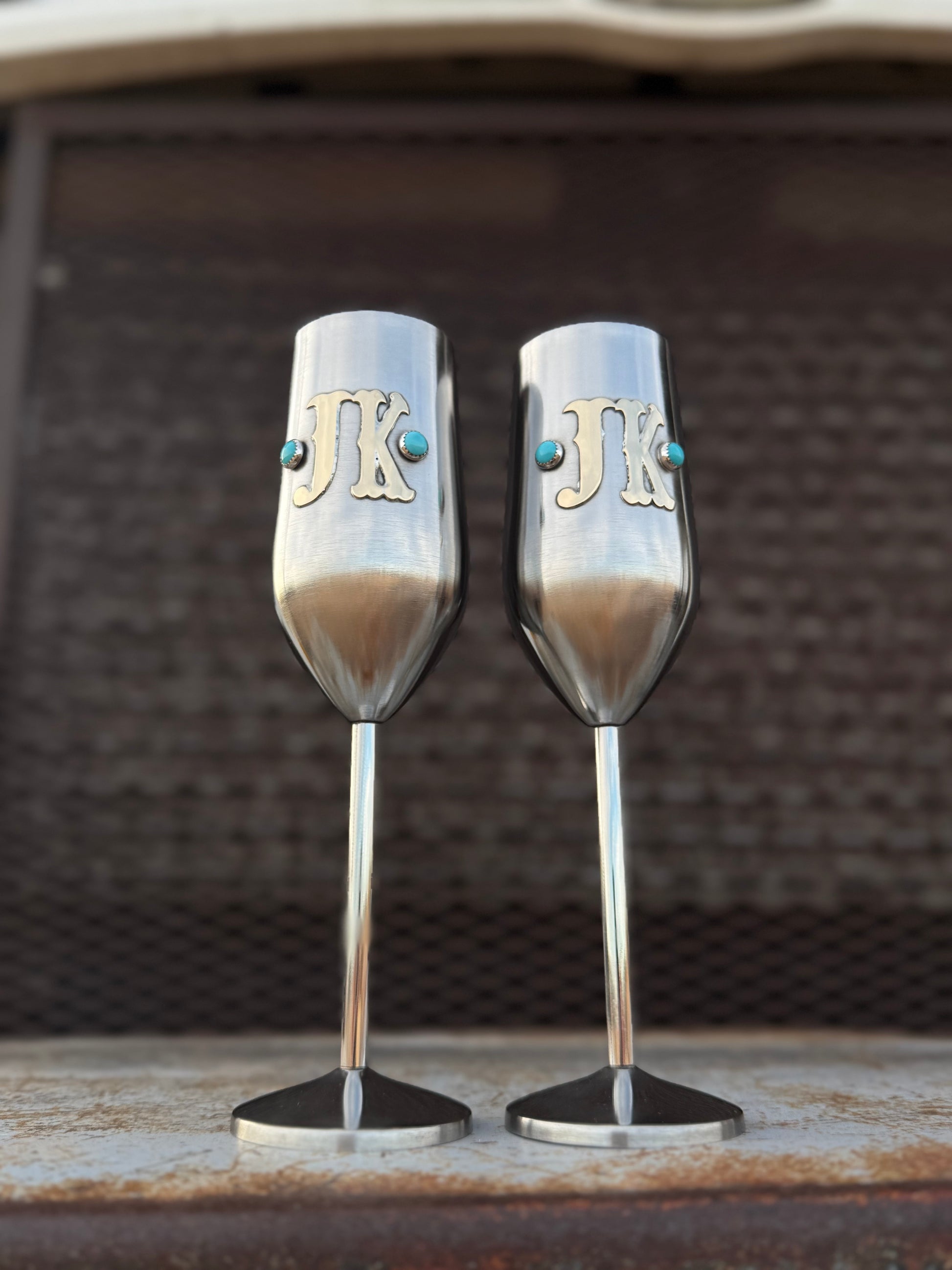 Celebrate in style with our set of two custom stainless steel toasting flutes. Each set of flutes can be personalized with your choice of initials or brand, with your choice of silver, copper, or brass for the metal accents. For a little added flair, you have the option to include genuine natural turquoise.