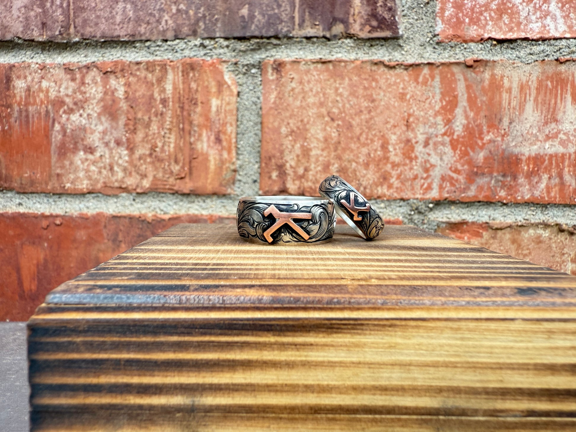 Solid sterling silver wedding band with hand engraved scrollwork, approximately 6 mm in width. Available with standard engraving or deep relief engraving as an upgrade. You can also add your brand as an overlay in copper, silver or brass.
